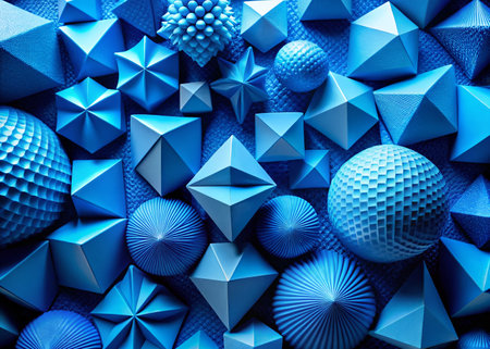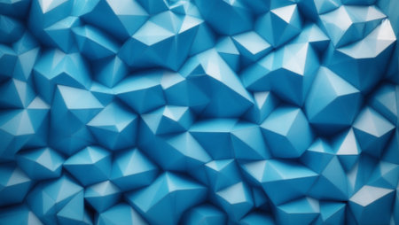 A striking abstract composition features vibrant blue geometric shapes artfully arranged to create a modern textured background design. This dynamic pattern incorporates 3D polygonal elements with a layered texture, resulting in a bright, contemporary feel. The gradient of cyan and indigo hues adds depth, making this graphic ideal for digital art, wallpaper, or creative projects. The design's angular style and minimalist composition offers a fresh and artistic backdrop.