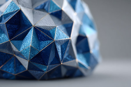 A close-up view of an abstract geometric structure featuring reflective blue and silver triangular facets. this contemporary design element is perfect for modern art, interior decoration, or digital design inspiration. Generative AI