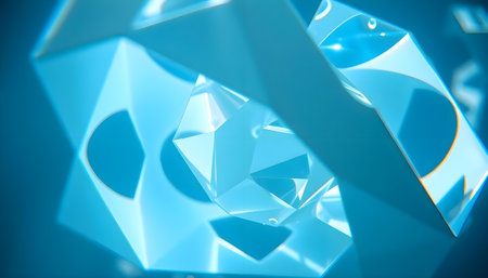This captivating image showcases an array of shimmering blue crystal geometric shapes reflecting light, creating a vivid and artistic display.