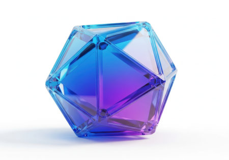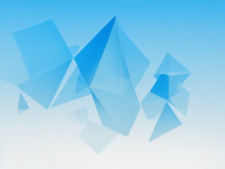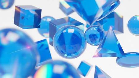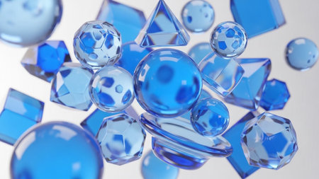 Blue transparent geometric shapes like cubes spheres and pyramids float with light refractions and subtle iridescent...