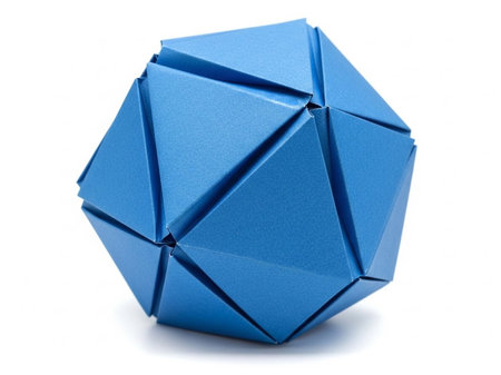 A complex multicolored geometric shape resembling a star, crafted from paper, sits on a smooth blue surface against a matching background, lit from the side.