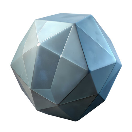 A blue and gray faceted geometric sphere with sharp edges and smooth surfaces, lit to show subtle reflections and shadows.