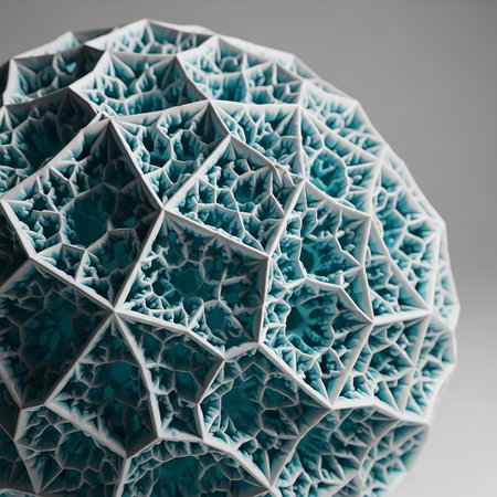 A close-up of a complex, geometric fractal sphere in turquoise and white, showcasing intricate details and sharp edges.