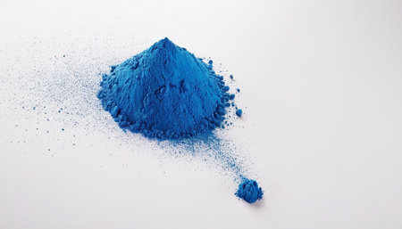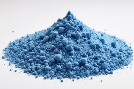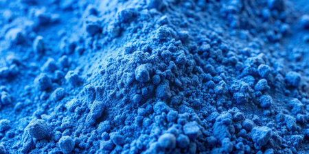 Blue pigment powder close-up. Macro shot of vibrant blue powder particles forming textured mounds on a dark surface with dramatic lighting.