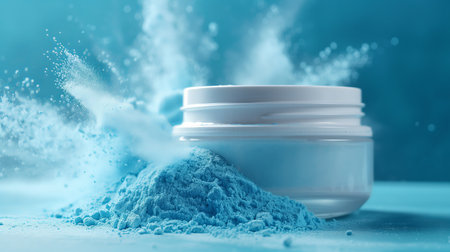A dental powder products in a white jar with lid open, surrounded by light blue powder dust.