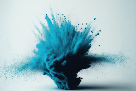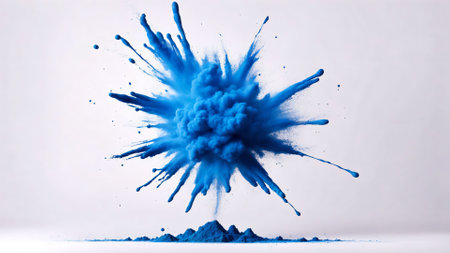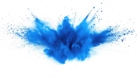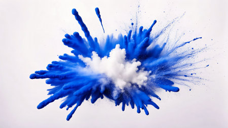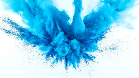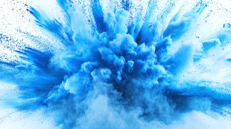 A vibrant blue powder explosion captured mid-air against a pristine white background, showcasing dynamic motion and vivid contrast, perfect for abstract or festive themes.