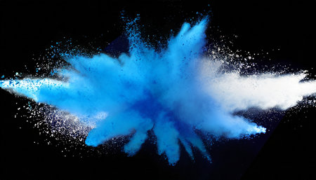 An explosion of bright blue powder on a black background, created with Generative AI technology.