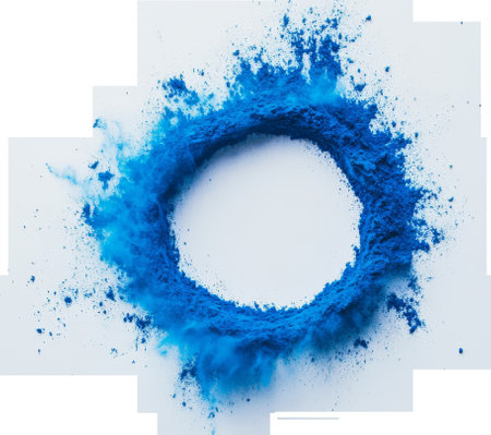 Blue powder explosion creating a ring shape on transparent background. Abstract art and color concept