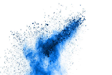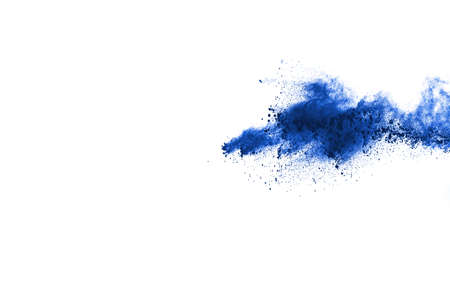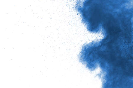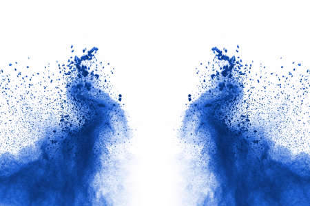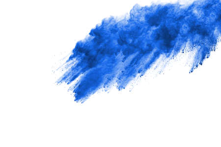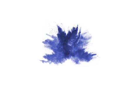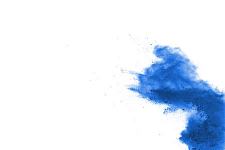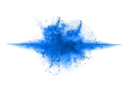 Blue powder explosion isolated on white background. Colorful dust cloud.