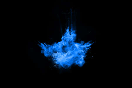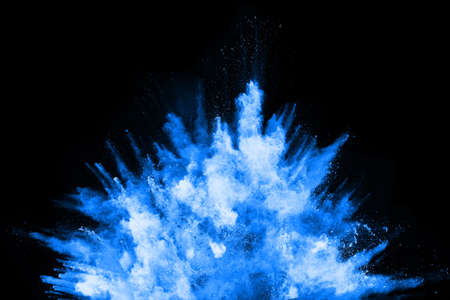 Blue powder explosion on black background. Colored cloud. Colorful dust explode. Paint Holi.