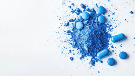 A collection of blue capsules scattered amidst a vibrant powder on a white surface, inviting exploration and evoking a sense of curiosity and wonder.