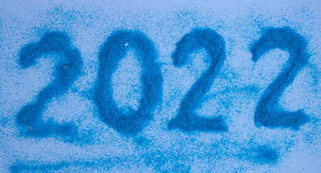 Numbers 2022 on blue sequins.Happy new year 2022. New year's concept
