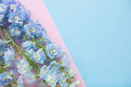 Beautiful blue delphinium on multicolored paper backgrounds with copy space. Spring, summer, flowers, color concept, women's day.