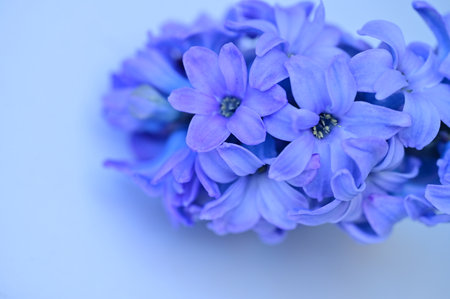Blooming Blue hyacinth flower on blue background. Copy space.