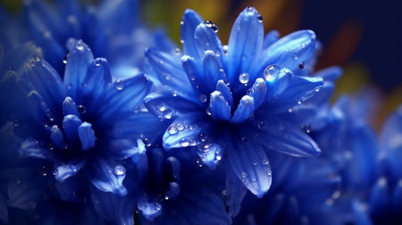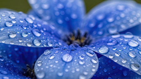 This macro photograph presents a vivid blue flower, its petals adorned with numerous water droplets. The image showcases the delicate textures and forms, with a shallow depth of field emphasizing the center. The soft lighting suggests a natural outdoor setting, and this image may be suitable for various commercial or artistic projects.