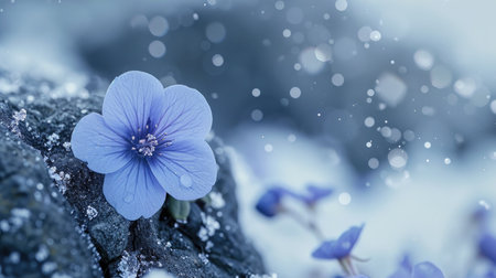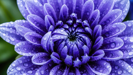 A stunning closeup of a purple flower adorned with water drops, capturing the delicate beauty of nature. Perfect for themes of freshness and tranquility.