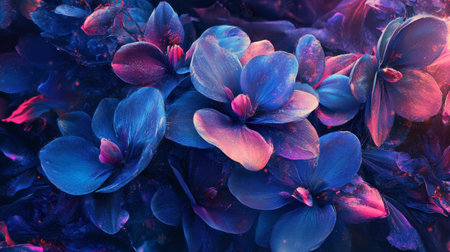 Explore a stunning arrangement of vibrant blue and purple flowers set against an abstract background, showcasing beauty, elegance, and a touch of fantasy.