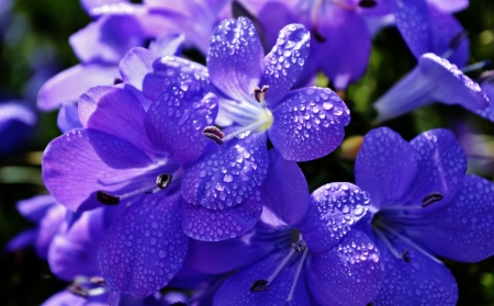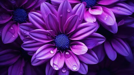 Vibrant purple flowers adorned with droplets of water create stunning visual display, showcasing nature beauty and elegance. rich colors and textures evoke sense of tranquility and freshness