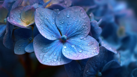 A close-up image of blue hydrangea flowers with glistening raindrops, showcasing their intricate texture and vibrant colors, perfect for nature enthusiasts and floral designs.