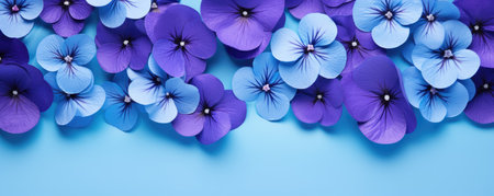 Frame made of beautiful violet and purple pansy flowers on light blue background with copy space. Floral spring backdrop. Border for design greeting card or banner for wedding