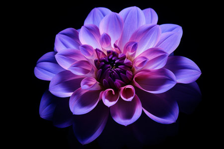 A detailed close-up presents a fully bloomed dahlia, displaying layered purple petals. The image shows intricate textures and color gradients, suggesting soft lighting. The composition emphasizes the flower's form, likely suitable for decorative purposes or as a design element. Potential uses include editorial content.