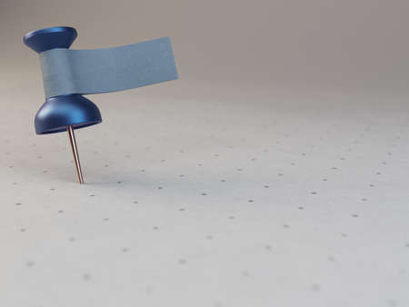 A blue thumbtack with a blank tape tag attached to it on a textured and printed paper surface -3D render