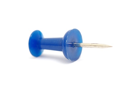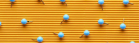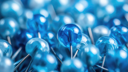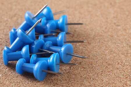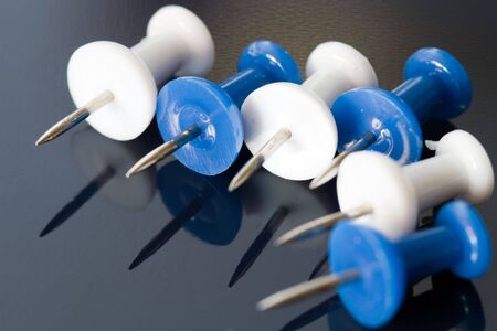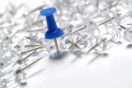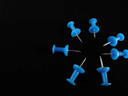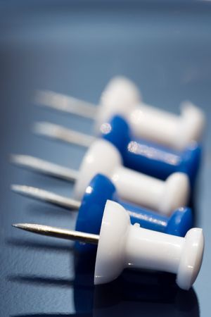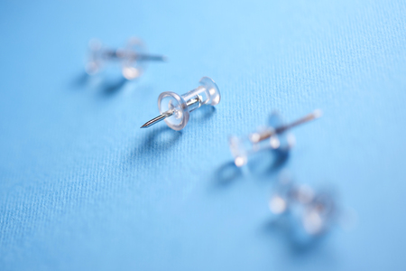 Blue pushpins on the blue backgound. Top view of lots of push pins