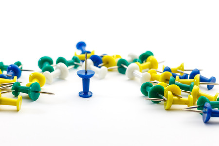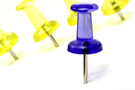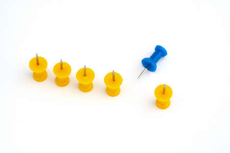Four yellow tacks together, and one tack blue isolated from the rest, Focus in blue tack