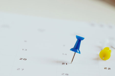 Colored push pins on monthly calendar page. Calendar appointments. Multicolored push pins on calendar. Marked event day, business appointment, meeting with pin. Close-up of push pins on calendar date