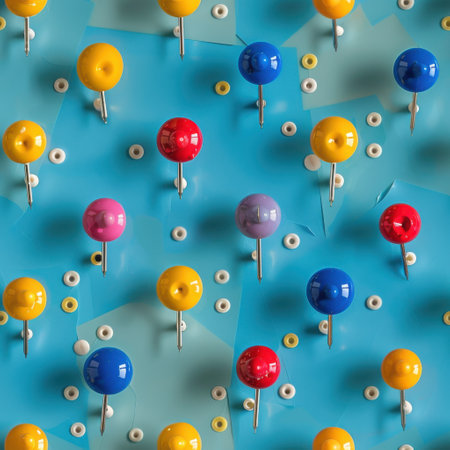 This image features a close-up shot of colorful push pins arranged on a blue and white surface. The push pins are various colors, including yellow, red, blue, and purple. The background is made up of light blue and white paper, with some of the paper cut into abstract shapes. The push pins are all facing the camera and their points are visible. The image is taken from a high angle.