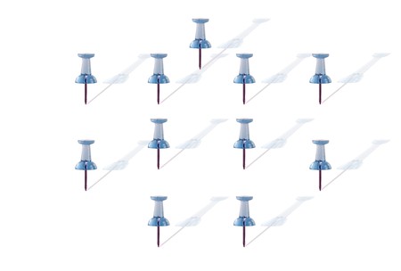 on composition 4 four red from plastic and metal pins for paper in horisontal formation surrounded from front and back by 3 three white pins. i call it pin plan, pin war