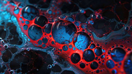 Abstract close-up of red and blue organic shapes resembling cellular structures with glowing highlights