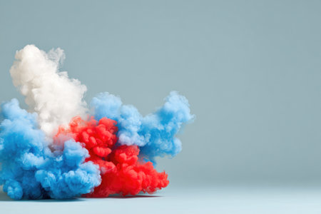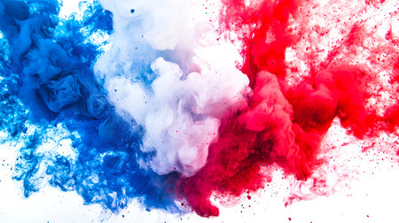 Multicolored clouds of smoke in blue, white and red colors. The flag of France is made of holi colors exploding on a white background. Beautiful background backdrop for the design.