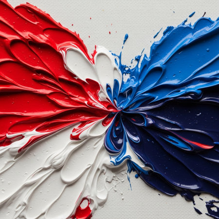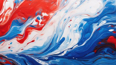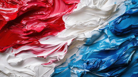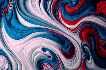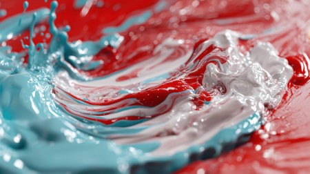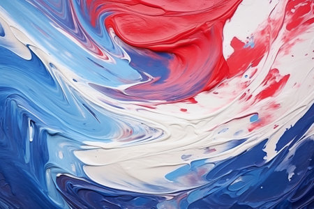 Bright swirls of paint blend together in striking red, white, and blue hues, forming a rich, textured surface. The colors amplify each other, creating a vibrant artistic display.
