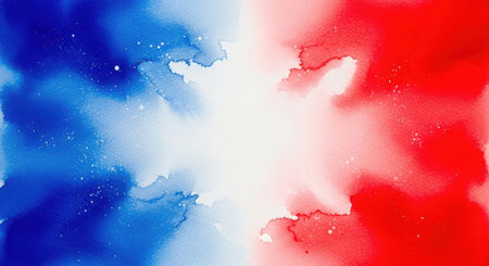 A vibrant and abstract watercolor painting featuring a blend of blue and red hues with a white center. The colors merge seamlessly, creating a dynamic and visually appealing gradient effect. The artwork showcases a modern and artistic style, perfect for various design applications.