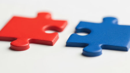 Red and blue puzzle pieces symbolize connection. Problem-solving concept with two contrasting pieces. Interlocking shapes on white.