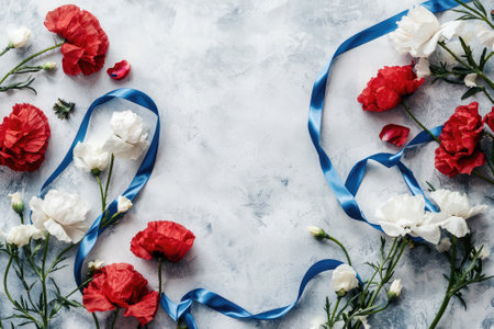 Red and white poppies with a blue ribbon on a textured background