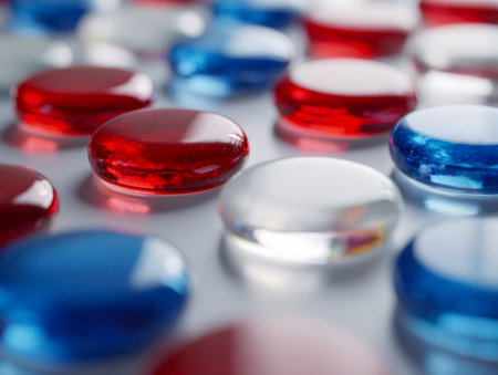 Vivid gel capsules in patriotic hues form an eye-catching pattern, their shiny surfaces reflecting light against a sleek backdrop, symbolizing health and wellness.