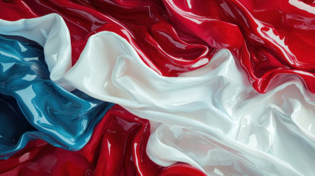 Smooth fabric displays rich red, white, and blue colors, creating a dynamic wave effect. The shiny surfaces reflect light, enhancing the visual appeal of the vibrant textiles.
