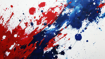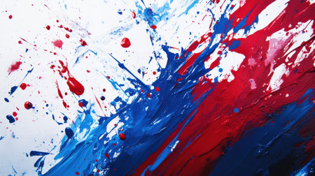 Bold splashes of red and blue paint create an energetic display on a white canvas, showing a striking example of abstract expressionism that captivates the viewer.