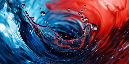Intense red and blue liquid splashes collide and swirl, creating dynamic abstract fluid with visible water droplets...