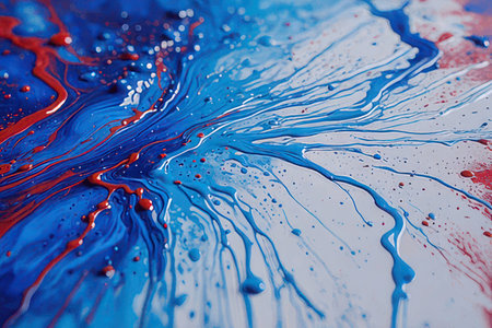 Bright blue, red, and white paint splashes intermittently, forming swirling patterns on a surface. The dynamic colors suggest a lively artistic endeavor taking place.