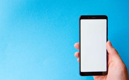 Close-up of a womans hand with a smartphone on which there is a white screen for advertising, on a blue background. Copy paste.