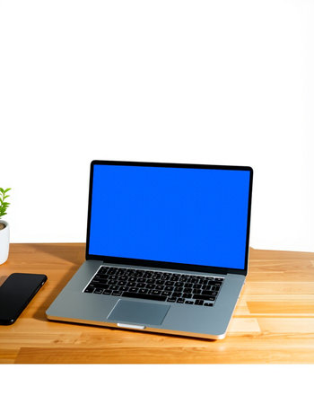 hands of a man handling a cell phone attached to a laptop with a white screen on a wooden desk with blue lighting, laptop mock up and smart phone