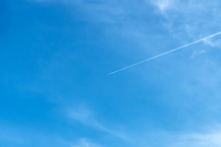 A serene view of a jet plane leaving a vapor trail in a clear blue sky capturing the essence of travel.
