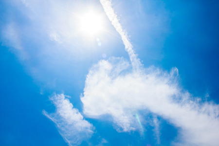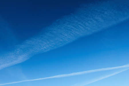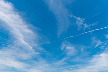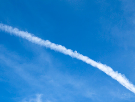 Airplane vapor trail or contrail pattern on blue sky with clouds from below