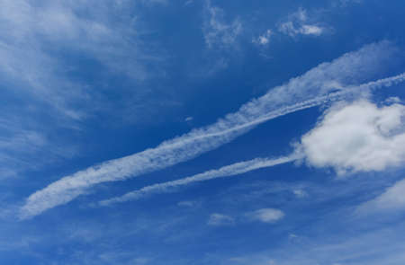 Aircraft condensation contrails in the blue sky inbetween some clouds