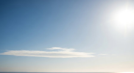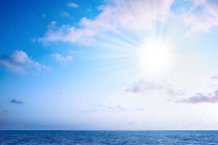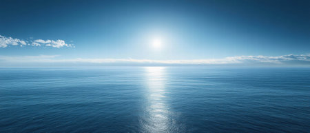 A beautiful wide-angle shot from the waters surface looking out at the calm blue sea and a vast sky with bright sun and light clouds. A tranquil and peaceful nature scene.