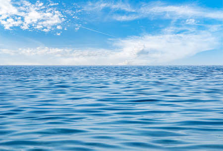 big blue surface of the water with ripples and the line of the horizon with the cloudy sky for a natural background
