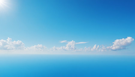 Above showing vast expanse of bright blue sky above a calm ocean with a horizon line and scattered white cumulus...